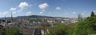 Вместо старого изрядно разбитого фотоаппарата приобрёл себе новый. Вчера, читая инструкцию, обнаружил новую интересную функцию: панорамная съёмка. Пришлось сегодня специально лезть на Цюрихберг, чтобы её опробовать. На всякий случай, если "вид сверху" не получится, сделал ещё одну панораму недалеко от дома. Очень, очень любопытная функция.